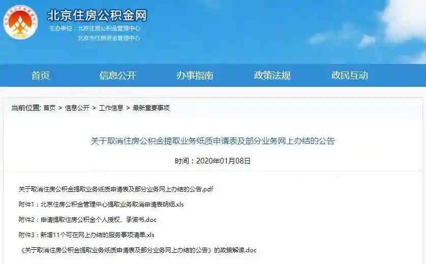 北京住房公积金管理中心于2020年1月8日发布《关于取消住房公积金提取业务纸质申请表及部分业务网上办结的公告》。