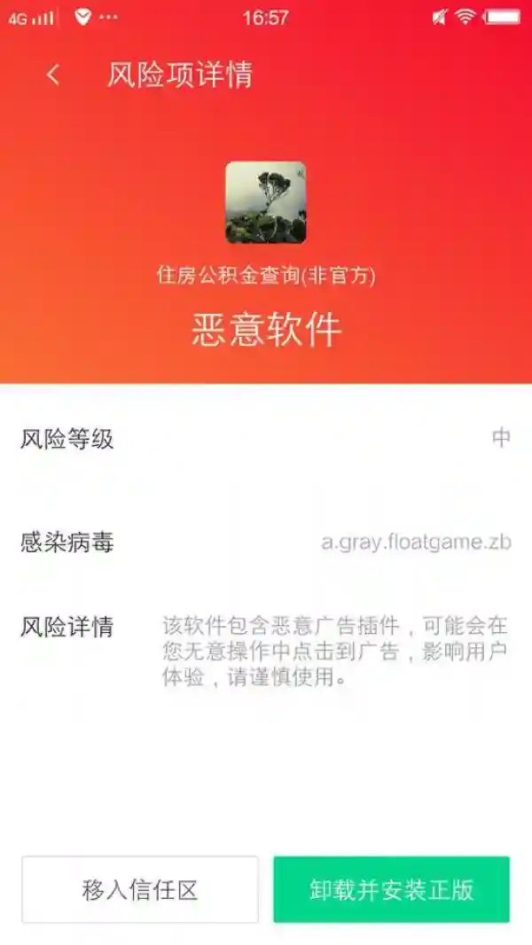 (图:腾讯手机管家查杀“住房公积金查询”(非官方)APP)
