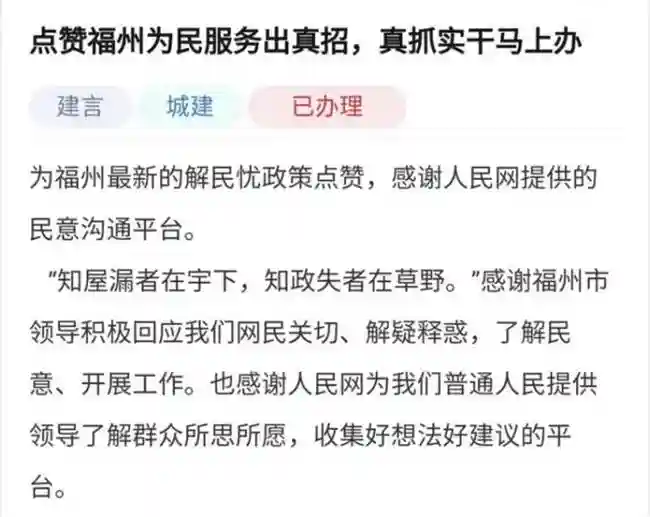 人民网福州(林晓丽、邱伟东)“为福州最新的解民忧政策点赞。”近日,人民网“领导留言板”收到了一条感谢留言。