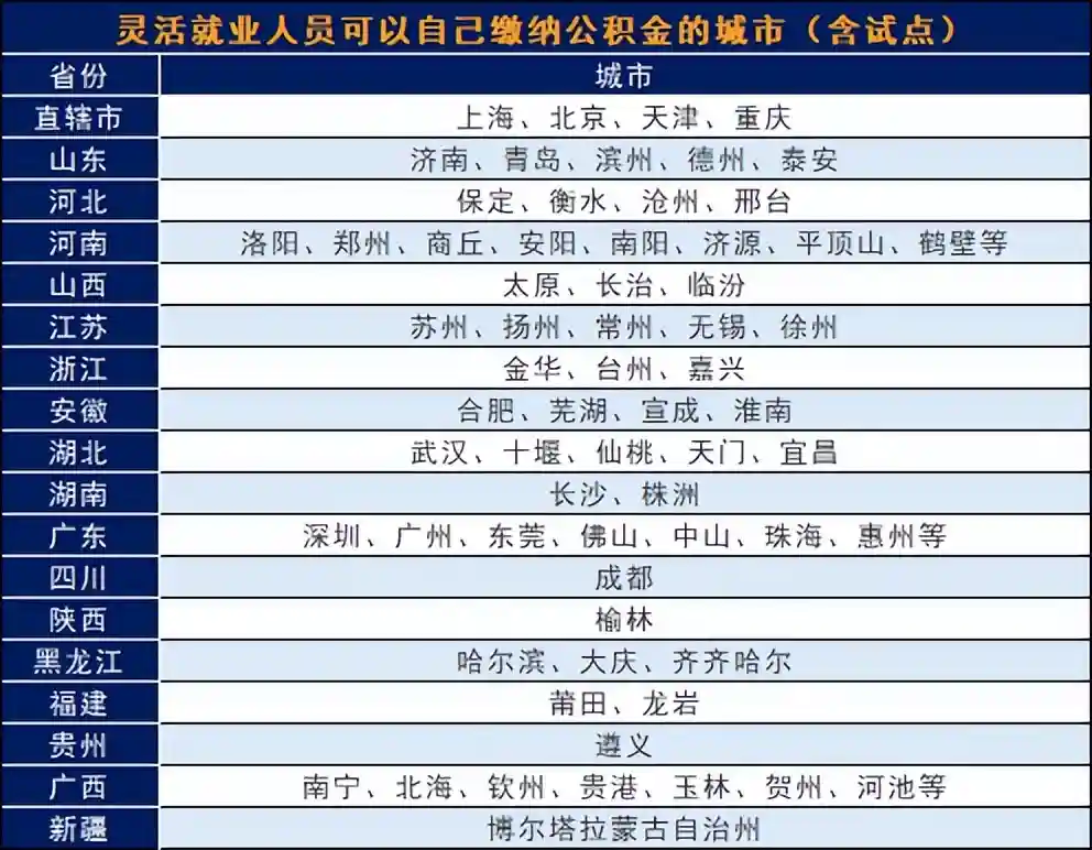 新的好消息是,去年开始,有6个城市开展了灵活就业人员参加公积金的试点工作,包括重庆、成都、广州、深圳、苏州、常州。