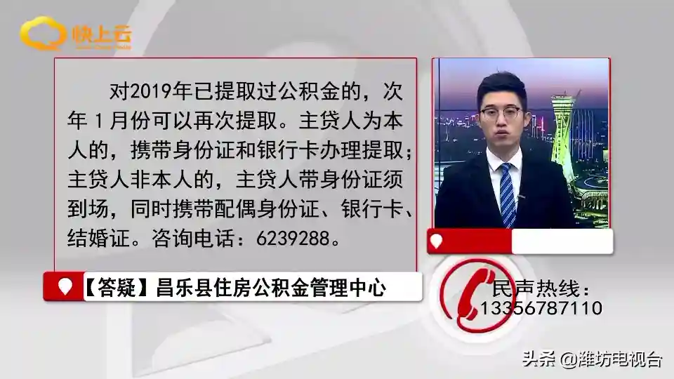 【回复】昌乐县住房公积金管理中心回复说,对2019年已提取过公积金的,次年1月份可以再次提取。主贷人为本人的,携带身份证和银行卡办理提取;主贷人非本人的,主贷人带身份证须到场,同时携带配偶身份证、银行卡、结婚证。咨询电话:6239288。